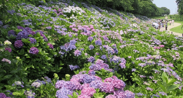 6月から7月上旬のかけてのアジサイの最盛期には、約100種16,000株以上の紫陽花が権現堂堤の斜面を埋め尽くします。