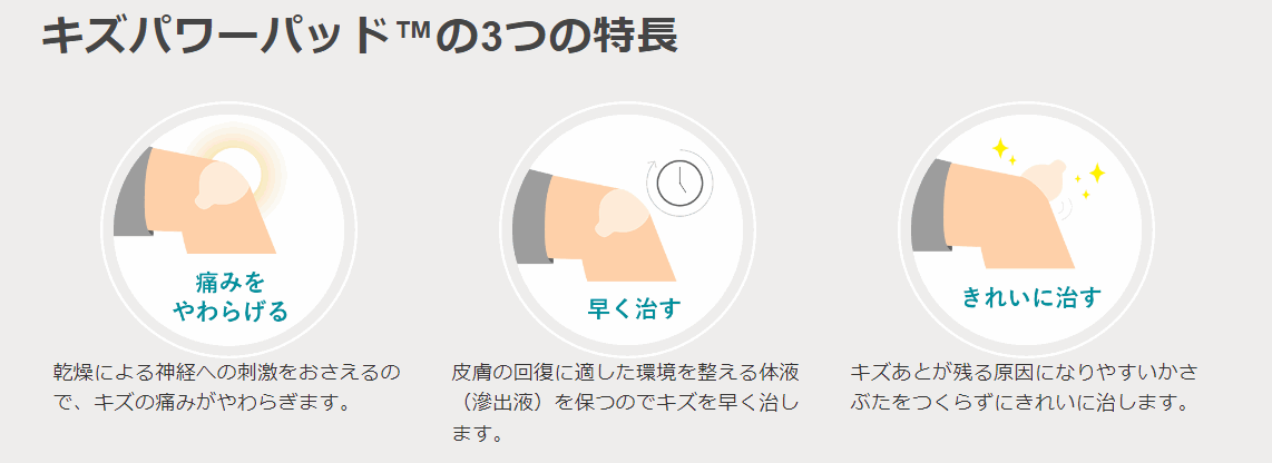 湿潤環境下療法といって、傷は湿り気がある状態だと回復が早くなります。キズパワーパッドは適度に患部の湿り気を維持して治していきます。