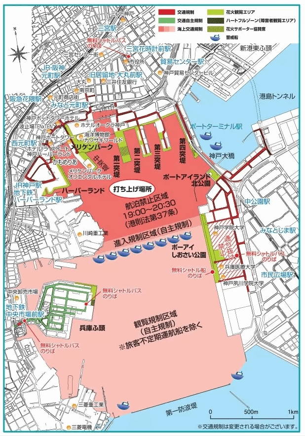 みなとこうべ海上花火大会2023に専用の駐車場はありません。会場周辺はマイカーでの来場不可です。公共交通機関の利用が望ましいです。